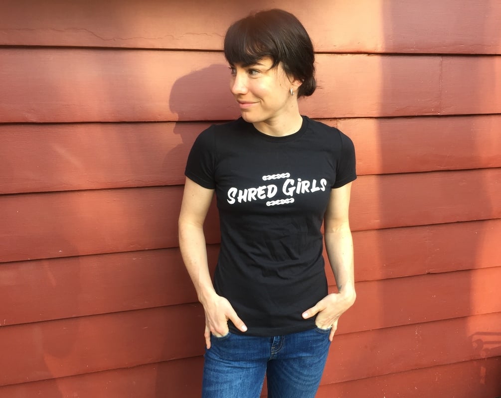Ultra-soft women's tshirt from Bella with the Shred Girls logo in white on a black background. Basically the comfiest shirt you'll ever own.